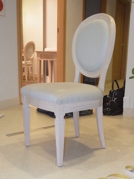 次の実例紹介は、港区にあるA社様、パウダールーム(控室)にある椅子のカバー。左が完成写真、右が仮縫い完成写真(写真をクリックで元椅子の写真)。元椅子はフレンチスタイルのバルーンバックスタイル。こちらも新規のカバー交換でご注文いただきました。使用場所、目的上、オーソドックスなデザインである必要から、スリットを入れ、背後でリボン結びで製作。スリットの開口感は椅子の胴回り寸法にをもとに、開き具合を決め、調整します、実例は若干絞り気味で軽く開く程度で仕上げてます。生地は椅子ソファ張込み用途織地で最初の実例生地より若干重たい生地を使ってます。