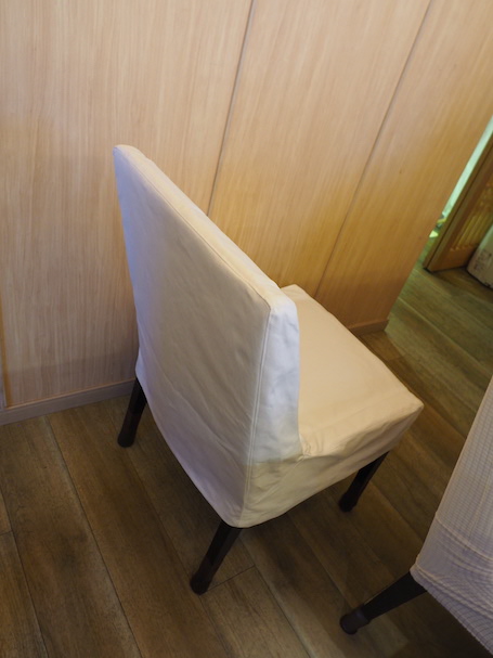 - カバー前の元椅子、一般的な飲食店向きのデザインと比べると、デザイン性があり、丸っこいフォルム。