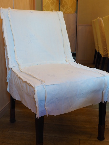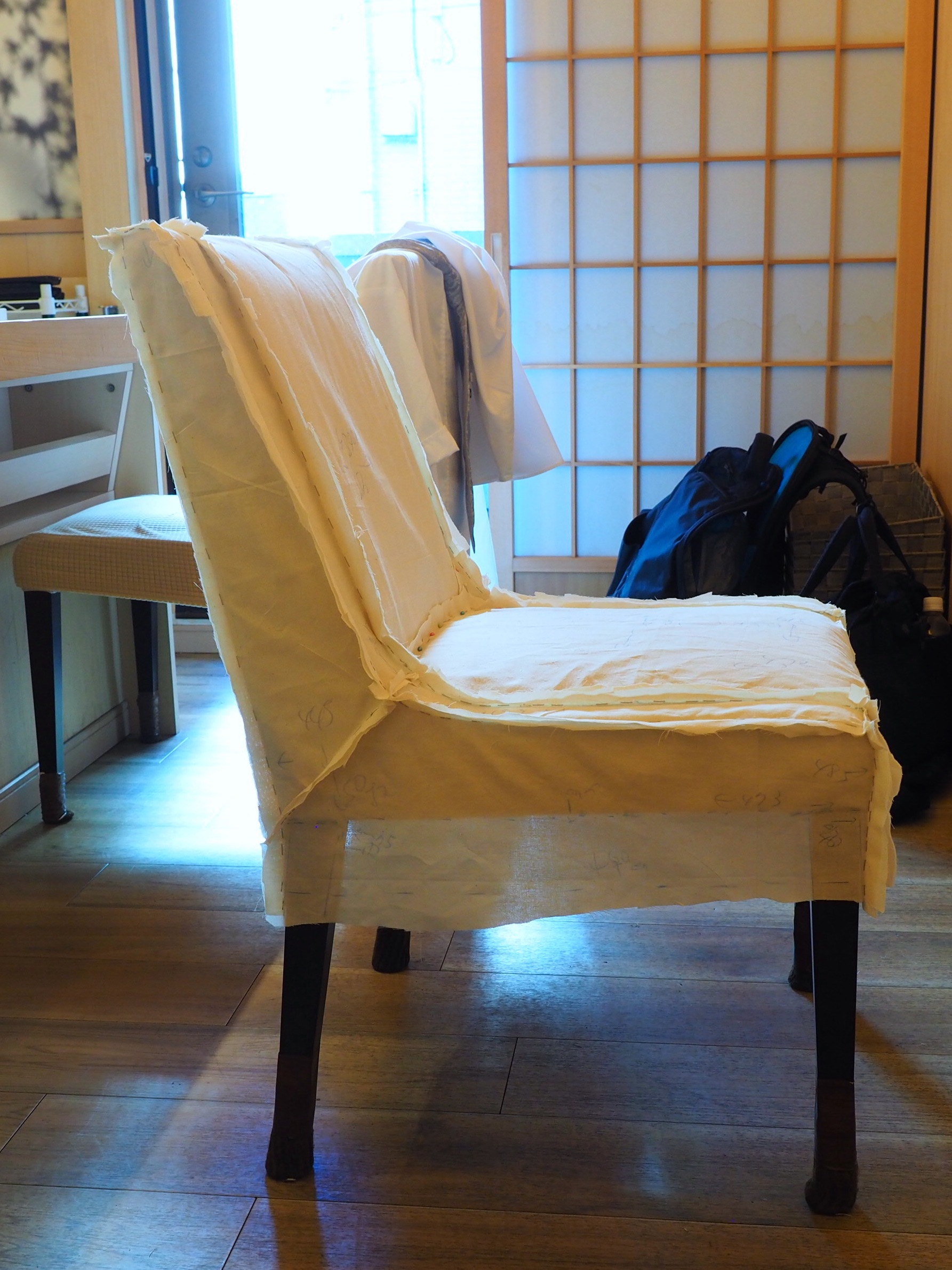今回の椅子、クッション性を持たせるため、体があたる箇所に綿が仕込んであり、凹凸の連続になっていて、フラットな面がありません、一般、店舗の場合は、お手入れの収縮など考慮して、綿生地は、若干、大きめに作り、カバーのパーツ分けは、複雑に分けないで、綿生地の重さで素直に下がり、張るように設定しますが、